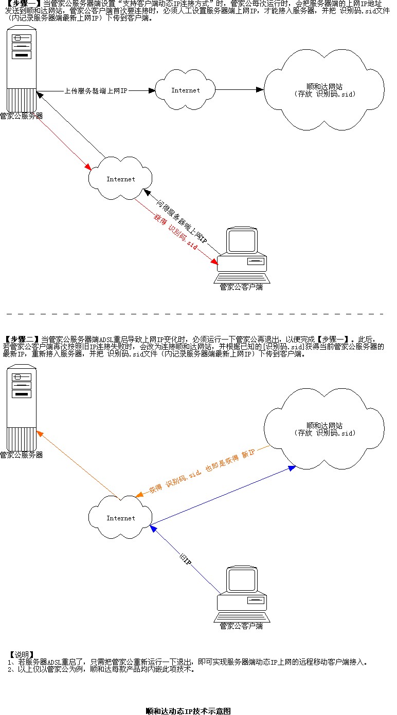 ·自動IP:對于動態(tài)IP上網(wǎng)的服務(wù)器端,無需任何工具或設(shè)置,即能相對固定地解析遠程或移動客戶端成功接入。一些品牌,則需用戶另外購買一套幾百至幾千元的動態(tài)IP固化解析軟件,或者,用戶需要每月向電信網(wǎng)絡(luò)供應(yīng)商繳納200-300元固定IP月租費開支。 (技術(shù)示意圖)